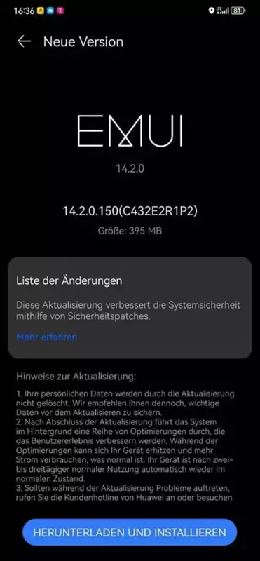 Według Huawei Blog, system został wydany z numerem kompilacji EMUI 14.2.0.150. Oprogramowanie waży 395 MB i jest już wdrażane na urządzenia falami.