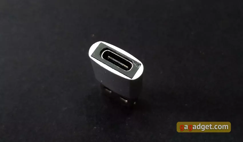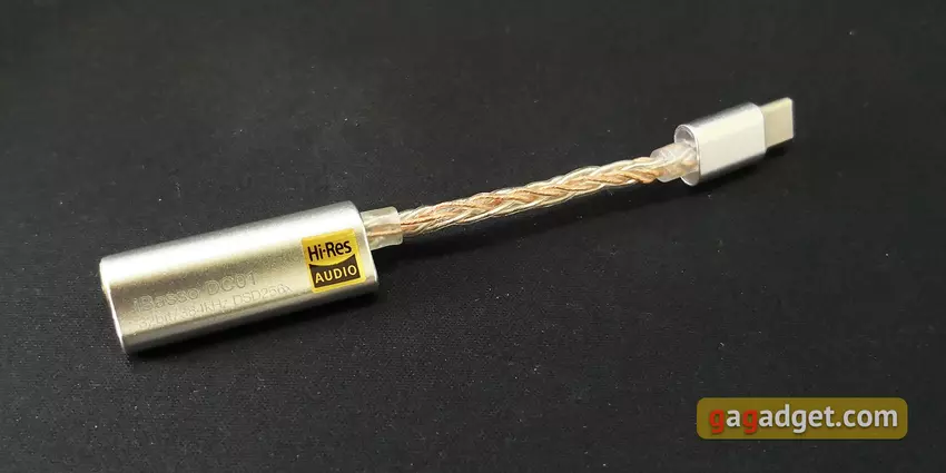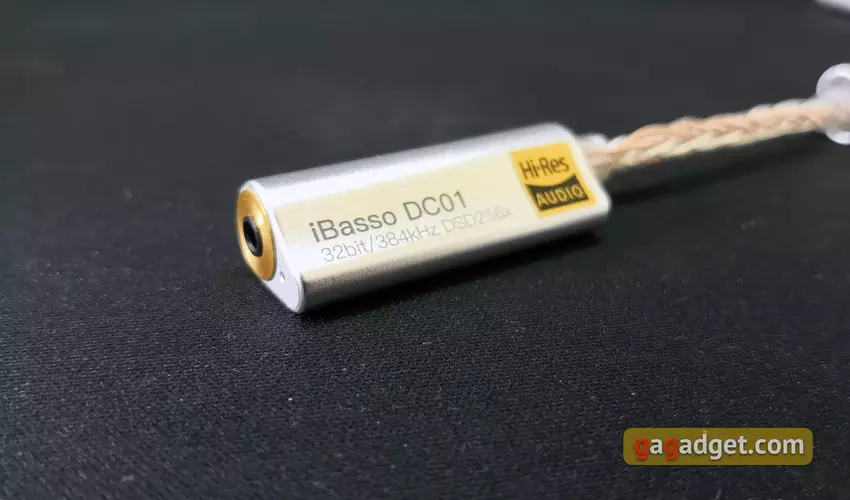 IBasso DC01 wygląda bardzo przyzwoicie, jeśli nie czepiać się do drobnostek, o których będziemy mówić poniżej. Urządzenie składa się ze złącza typu C i samego DAC, które są połączone przewodowym kablem. Kabel połączeniowy jest mały, wizualnie - podobny do kabli słuchawek iBasso. Chociaż w tym przypadku do niego jest nadawana „cyfra”, zamiast analogowego sygnału. Obie części są wykonane ze srebra. W bloku z całą główną elektroniką znajduje się nazwa modelu, informacje o wsparciu PCM 32 bity / 384 kHz i DSD256, a także dumna naklejka Hi-Res Audio: