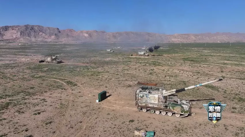 Wideo przedstawia chińskie samobieżne systemy artyleryjskie 155 mm PLZ-05. Materiał filmowy pokazuje, jak góra, tył, boki i przód samobieżnych systemów artyleryjskich są chronione siatkami.