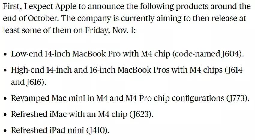 W niedawnym biuletynie Power On Gurman podzielił się informacjami, zgodnie z którymi wydarzenie odbędzie się 1 listopada 2024 r., Podczas którego Apple wprowadzi na rynek nową wersję budżetowego 14-calowego MacBooka Pro z chipem M4, a także potężne 14-calowe i 16-calowe modele MacBook Pro z procesorami M4 Pro i M4 Max.