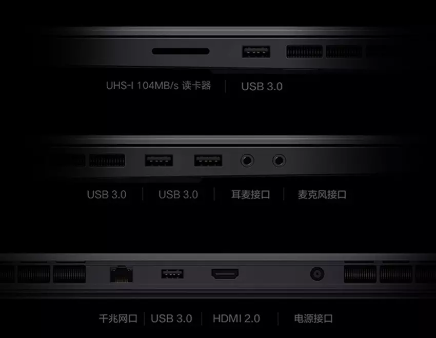 Zewnętrznie laptop do gier Mi jest taki sam jak w poprzednim modelu: te same złącza i podświetlana klawiatura, nawet ramki wokół ekranu nie są zmniejszone. „W zestawie” znajdują się cztery porty USB 3.0 typu A, złącze RJ-45, wyjście wideo HDMI, gniazdo karty pamięci, Wi-Fi i Bluetooth 5.0.