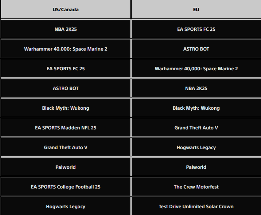 Symulatory sportowe stały się liderami na PS5. NBA 2K25 w USA/Kanadzie i EA SPORTS FC 25 w Europie.
