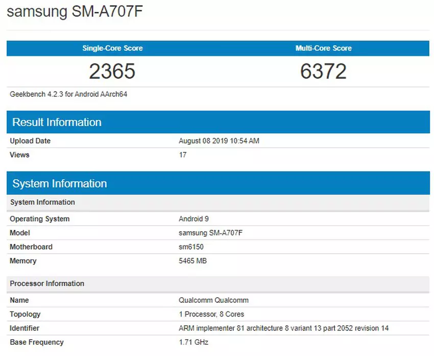 Samsung Galaxy A70s testował wydajność z numerem modelu SM-A707F. Urządzenie według raportu, które działa na Qualcomm Snapdragon 6150 ośmiurdzeniowym procesorze (czyli Snapdragon 675) w obsłudze z 6 GB pamięci RAM. Dla porównania, tradycyjny A70 posiada procesor Snapdragon 670. Dodatkowo, na pokładzie smartphonu instalowany system operacyjny Android 9 Pie.