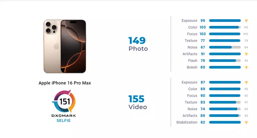 iPhone 16 Pro Max uzyskał 149 punktów w teście fotograficznym i 155 punktów w teście wideo. Ostateczny wynik 151 punktów czyni ten smartfon liderem w kategorii przednich kamer.