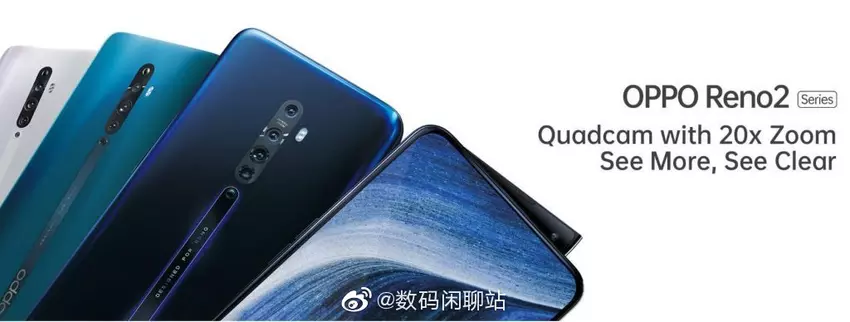 Sądząc po plakatach reklamowych, Oppo Reno 2 zachowa wygląd swojego poprzednika: wyświetlacz bez wycięć z cienkimi ramkami i wysuwany przedni aparat w module „fazowanym”.