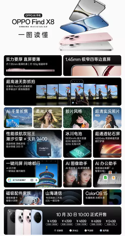 Find X8 posiada 6,59-calowy wyświetlacz LTPO AMOLED o rozdzielczości 1256p i częstotliwości odświeżania 120 Hz. Posiada również trzy aparaty o rozdzielczości 50 MP, w tym teleobiektyw z 3-krotnym zoomem. Przedni aparat o rozdzielczości 32 MP zapewnia wysokiej jakości selfie.