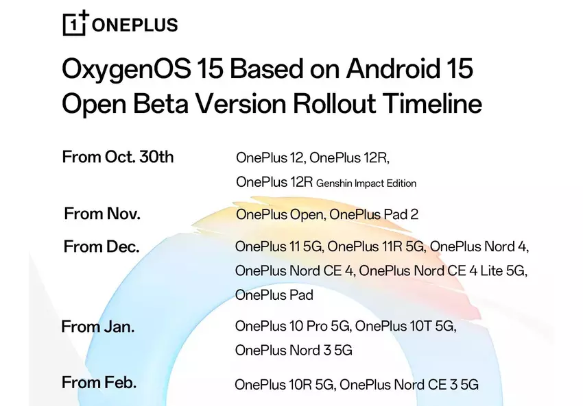 30 października OnePlus 12R również otrzyma aktualizację, w tym Genshin Impact Edition. Już w listopadzie beta będzie dostępna dla OnePlus Open i OnePlus Pad 2, a w grudniu dla OnePlus 11, OnePlus 11R, OnePlus Nord 4, OnePlus Nord CE 4, OnePlus Nord CE 4 Lite i OnePlus Pad. OnePlus 10 Pro, OnePlus 10T i OnePlus Nord 3 otrzymają aktualizację w styczniu, podczas gdy OnePlus 10R i OnePlus Nord CE 3 otrzymają aktualizację w lutym.
