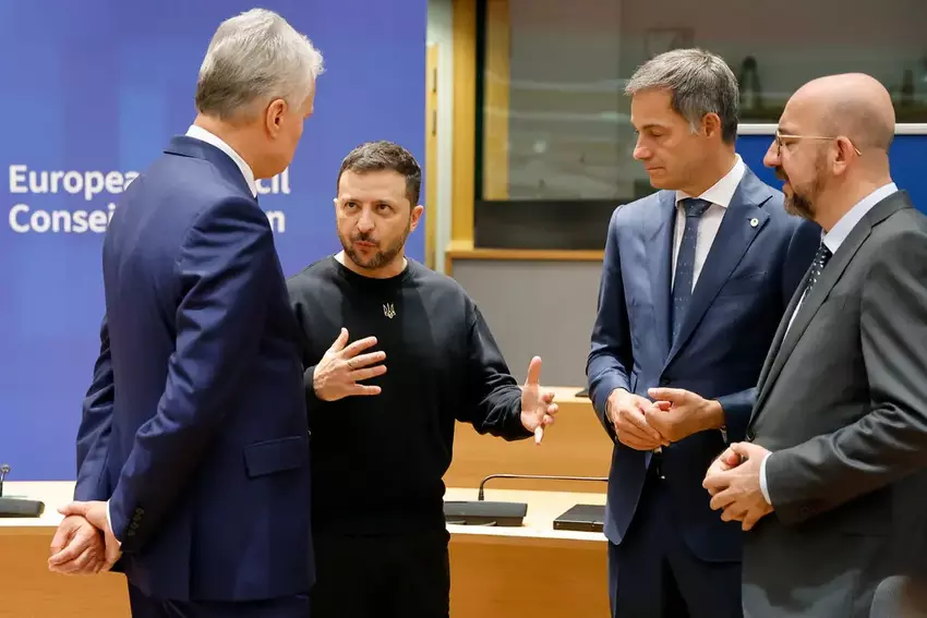 Prezydent Ukrainy Wołodymyr Zełenskij rozmawia z przywódcami Litwy, Belgii i Rady Europejskiej na szczycie UE