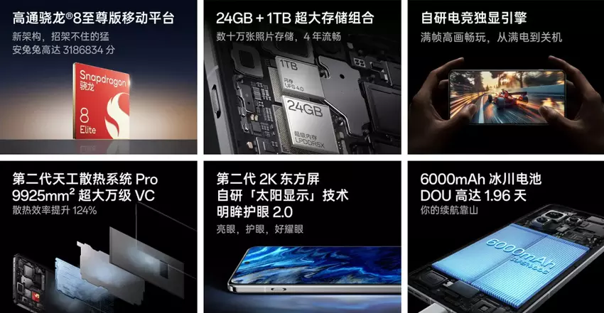 Urządzenie jest napędzane procesorem Snapdragon 8 Elite i jest dostępne w wariantach 12 GB, 16 GB i 24 GB (LPDDR5X) pamięci RAM. Wbudowana pamięć masowa wynosi od 256 GB do 1 TB (UFS 4.0). Smartfon posiada 6,82-calowy wyświetlacz BOE X2 AMOLED o rozdzielczości 3168 x 1440 pikseli, adaptacyjnej częstotliwości odświeżania od 1 do 120 Hz i maksymalnej jasności 4500 nitów.