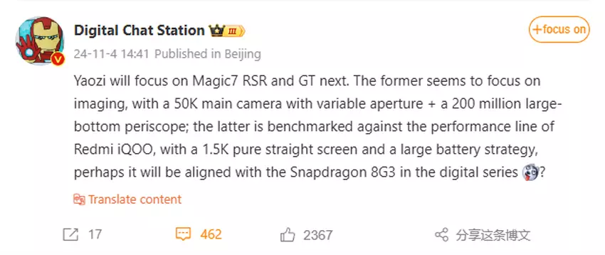 Magic 7 RSR będzie wyposażony w 50-megapikselowy aparat główny ze zmienną przysłoną dla optymalnego przechwytywania światła, 200-megapikselowy peryskopowy teleobiektyw oraz 50-megapikselowy aparat ultraszerokokątny. Oczekuje się, że urządzenie zostanie wydane w grudniu 2024 roku.