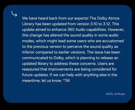 Samsung początkowo zaprzeczał istnieniu problemu, ale po licznych skargach potwierdził jego istnienie i powiedział, że pracuje nad rozwiązaniem. Firma stwierdziła w oświadczeniu, że problem był spowodowany aktualizacją biblioteki Dolby Atmos z wersji 3.10 do 3.12, która miała na celu ulepszenie funkcji 360 Audio, ale wpłynęła na inne aspekty dźwięku.