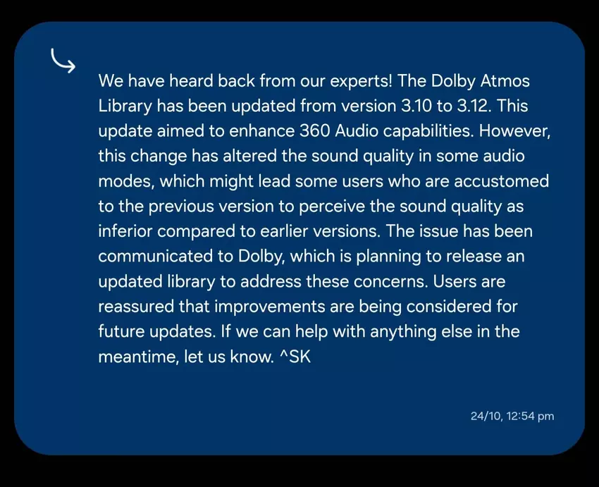 Samsung początkowo zaprzeczał istnieniu problemu, ale po licznych skargach potwierdził jego istnienie i powiedział, że pracuje nad rozwiązaniem. Firma stwierdziła w oświadczeniu, że problem był spowodowany aktualizacją biblioteki Dolby Atmos z wersji 3.10 do 3.12, która miała na celu ulepszenie funkcji 360 Audio, ale wpłynęła na inne aspekty dźwięku.