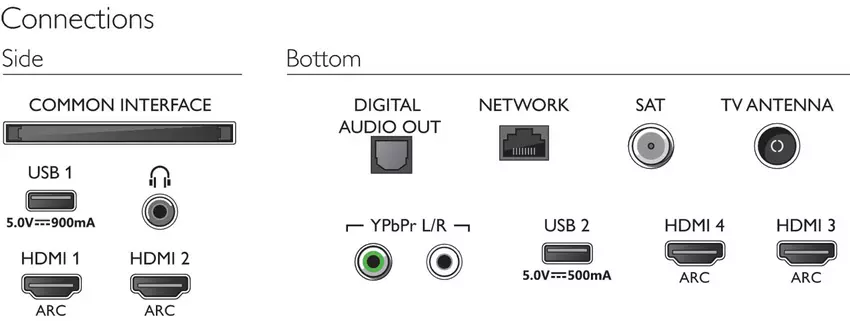 Oprócz połączeń bezprzewodowych przez Bluetooth i Wi-Fi, Philips 50PUS7334 ma na pokładzie cztery złącza HDMI do podłączania urządzeń zewnętrznych, dwa porty USB, wyjście słuchawkowe (specjalne podziękowania), cyfrowe wyjście audio, wejście Ethernet, wejście anteny i sygnał satelitarnego, a także wejścia komponentowe YPbPr.