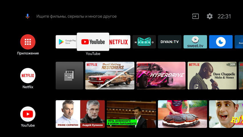 Oczywiście w każdym Smart TV istnieje teraz możliwość dostosowania pulpitu (ekranu, który pojawia się po włączeniu telewizora), ale w Android TV ta opcja jest jeszcze szersza - pozwala nie tylko usunąć skrót z aplikacji usługi wideo, ale także wybrać osobno różne listy. Ich liczba zależy od zastosowania. Na przykład przyniosłem listy Megogo na pulpit i teraz mogę zobaczyć (i natychmiast uruchomić określony film lub serial) sekcję z premierami, listę moich wyświetleń i tak dalej. Nawiasem mówiąc, Twich miał trzy takie listy: wybrane przez użytkownika, popularne i zalecane przez samą usługę nadawczą.