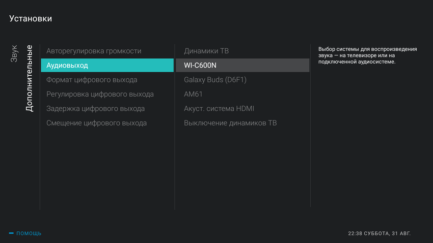 Kolejne dobre słowo zasługuje kontrola dźwięku w tym telewizorze. Możesz włączyć / wyłączyć Dolby Atmos, aktywować funkcję poprawy mowy w programach telewizyjnych, włączyć specjalny tryb nocny (aby nie straszyć domu i sąsiadów głośnym dźwiękiem, ale wszystko dobrze słyszeć). Istnieją osobne ustawienia, które uwzględniają umieszczenie telewizora - na ścianie lub na stojaku.