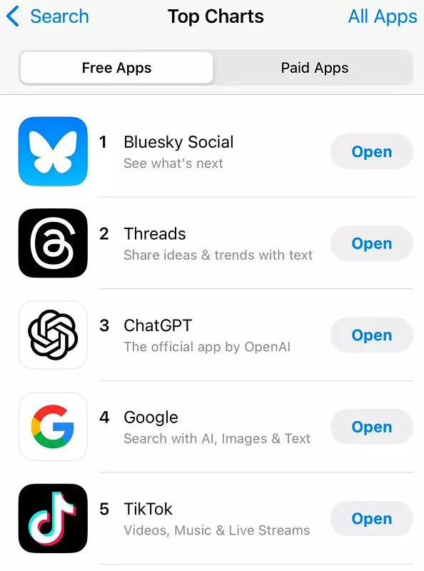 Bluesky jest obecnie najpopularniejszą aplikacją w App Store, wyprzedzając takich gigantów jak Threads, ChatGPT i Google.