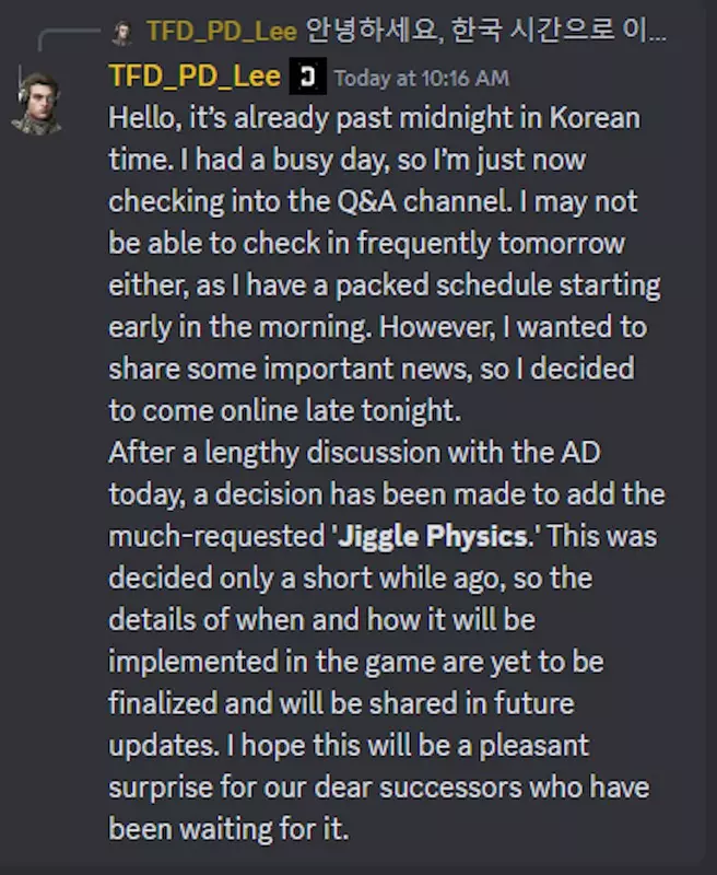 Studio Nexon ogłosiło, że w związku z "licznymi prośbami graczy" doda do The First Descendant zaawansowaną i realistyczną fizykę poszczególnych części ciała, przede wszystkim dotyczy to piersi i ud.
