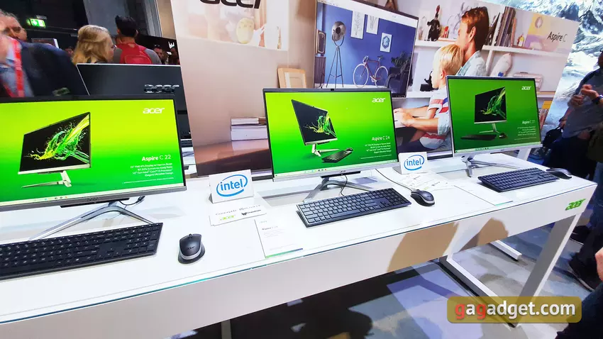 Również na wystawie pokazano nową linię monobloków serii Acer C. Dostępne będą opcje z wyświetlaczami 22, 24 lub 27 cali. W każdej z opcji rozdzielczość będzie wynosić FullHD. Wewnątrz znajdują się procesory Intel Core 10. generacji, do 32 GB pamięci DDR4-2666 RAM oraz dyski SSD M.2 NVMe o pojemności do 1 TB i dodatkowy 2,5-calowy dysk twardy 2 TB są używane jako dyski. W najlepszych konfiguracjach zostanie zainstalowana dyskretna grafika GeForce MX130. Monobloki są wyposażone we wbudowane kamery internetowe z kurtyną dla paranoików. Jest wyjście HDMI i cztery złącza USB 3.1 Gen 1. Monobloki wejdą do sprzedaży w lutym, cena rozpocznie się od 2700 złotych.
