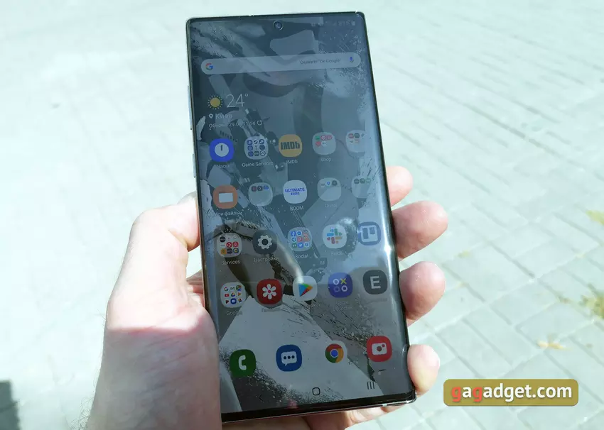 Konstrukcja Samsunga Galaxy Note10 + znacznie różni się od poprzedniej generacji: ekran znacznie się powiększył, a ramki wokół obwodu stały się mniejsze. Galaxy Note10 + zbliżył się do prawie całkowitej eliminacji ramek ze wszystkich stron, wygląda bardzo fajnie. Ale kamera przednai znajduje się bezpośrednio na ekranie. I jego dziura znajduje się dokładnie na środku, co jest bardziej estetyczne niż bok linii Galaxy S10. Po zainstalowaniu odpowiedniej tapety otwór staje się prawie niewidoczny. W rzeczywistości na panelu przednim nie ma nic więcej, nie mogłem zobaczyć słuchawki (ale ona tam jest), a wskaźnik LED został całkowicie usunięty. To ostatnie jest równoważone obecnością Always on Display.