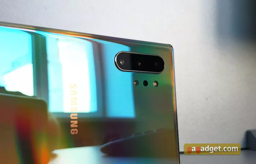 Kamera główna Samsunga Galaxy Note10 + ma bardzo podobne cechy do Galaxy S10 +, różnic są tylko kilka. Główny moduł jest taki sam: 12 megapikseli, zmienna przysłona f / 1,5-2,4, kąt widzenia 77 °, rozmiar piksela - 1,4 mikrona, stabilizacja optyczna. Teleobiektyw dla zoomu nieco się zmienił: rozdzielczość jest taka sama, 12 MP, ale optyka jest szybsza, z przysłoną f / 2.1 (zamiast 2.4), stabilnością optyczną, kątem widzenia 45 °, wielkości piksela 1,0 μm. Ultra szeroki - bez zmian: 16 MP, 123 °, f / 2.2, bez stabilizatora i autofokusa. Do nich dodano moduł DepthVision do pomiaru odległości dla obiektów. Kamera może rozmazać tło (w tym na wideo), robić zdjęcia szerokokątne i powiększać 2x bez utraty jakości. Kamera może zapisywać 4K 60k / s, 4K HDR10 + 30 f / si Super klatkę Super Slow Motion 960 na sekundę w rozdzielczości 1280x720 z możliwością wyboru czasu nagrywania 0,2 lub 0,4 sekundy, które są rozciągnięte. Kamera przednia ma 10 megapikseli, f / 2.2. Nie ma zasadniczych zmian w porównaniu do Galaxy S10 +, więc można oczekiwać, że jakość fotografowania będzie porównywalna. W pełni zaktualizowanych kamer należy spodziewać się w nowej generacji Galaxy S.