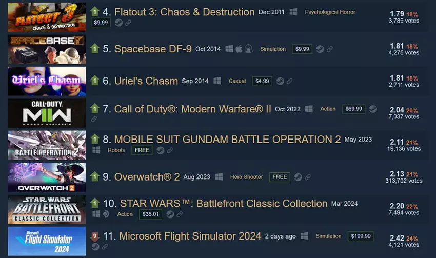 Oczywiście graczom nie spodobało się to wydanie i masowo zostawiają negatywne recenzje na temat gry. Gniew ludzi był tak silny, że Microsoft Flight Simulator 2024 trafił do "Hall of Shame" Steam i zajął 11. miejsce wśród gier z najgorszą oceną (24% pozytywnych recenzji, co już jest dobre, bo pierwszego dnia było to 17%).