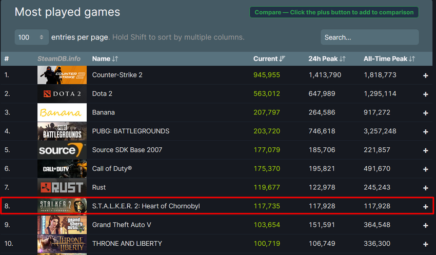 S.T.A.L.K.E.R. 2: Heart of Chornobyl ukraińskiego studia GSC Game World zaliczył świetny debiut na Steamie, wchodząc do pierwszej dziesiątki najpopularniejszych gier na platformie w dniu premiery. W szczytowym momencie liczba jednoczesnych graczy sięgnęła 113 tysięcy, co znacznie przewyższa wyniki poprzednich odsłon serii, w tym S.T.A.L.K.E.R.: Cień Czarnobyla (2007).