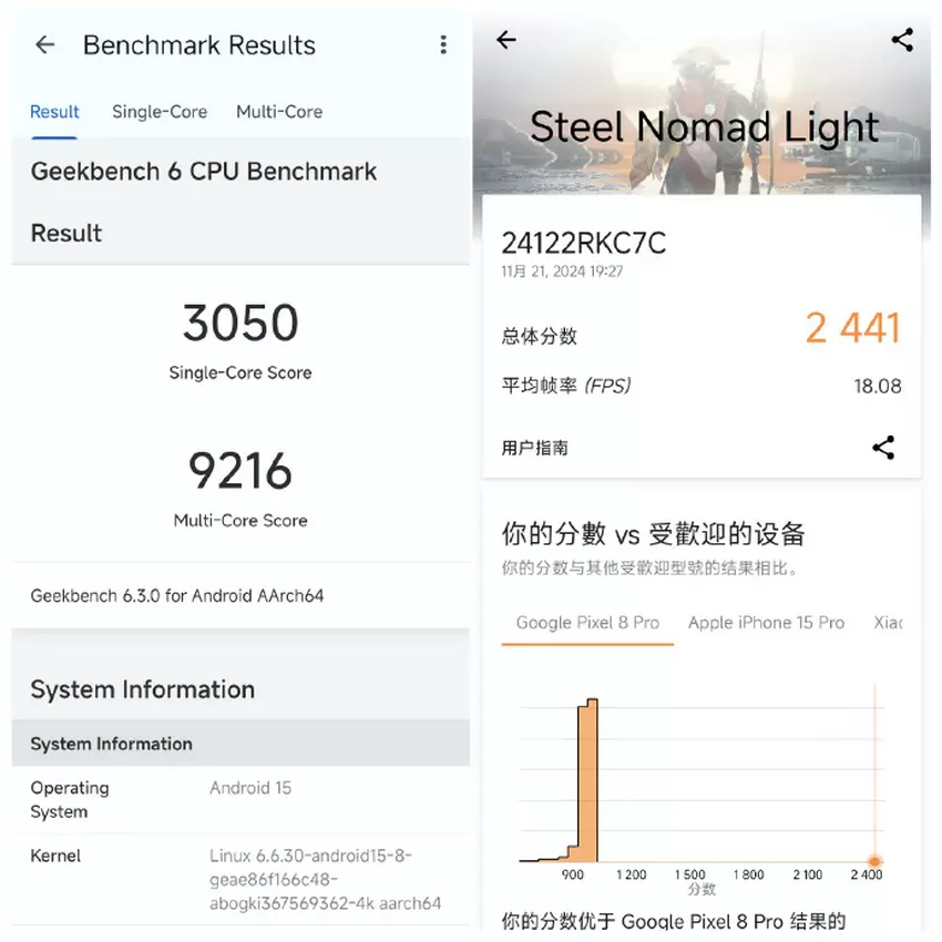 Test smartfona w Geekbench 6 zgodnie z oczekiwaniami wykazał wysokie wyniki 3050 punktów w teście jednordzeniowym i 9216 punktów w teście wielordzeniowym. W 3DMark Steel Nomad Light K80 Pro uzyskał 2441 punktów, co potwierdza jego wysoką wydajność graficzną.