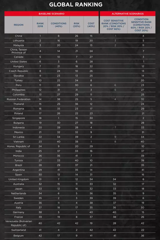 Tajwan - kolejna lokalizacja, która korzysta z wojny handlowej jest oczywiste. Tu koncentruje się większość wiedzy, a także produkcja komponentów. Wolumen eksportu w latach 2016-2017 wyspy przyszedł do światowej czołuwki 20 najlepszych. Trzeci jest elektroniką. Tajwan - jeden z liderów w dziedzinie półprzewodników. Również czwarte miejsce w światowym rankingu krajów do organizacji produkcji. Ocena bierze pod uwagę ryzyko, koszty i warunki prowadzenia działalności gospodarczej.