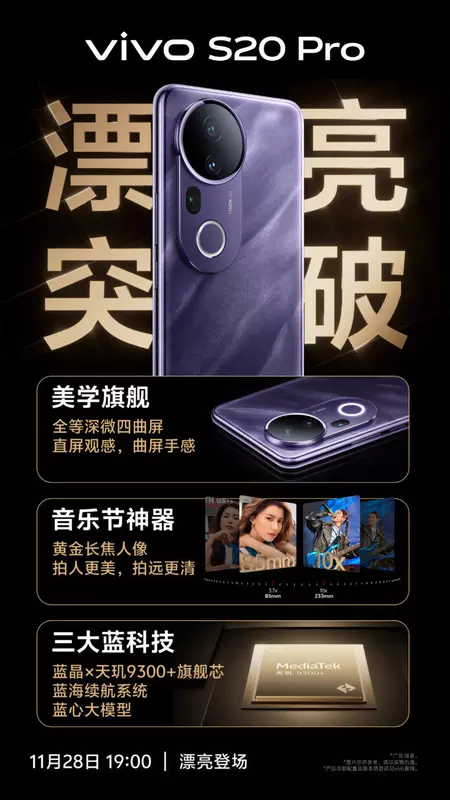 Vivo S20 Pro będzie wyposażony w ekran z mikrokrzywizną ze wszystkich stron i chipset Dimensity 9300+. Telefon otrzyma również nowy portretowy teleobiektyw ze 100-krotnym zoomem oraz technologię "Blue Crystal" poprawiającą wydajność termiczną.