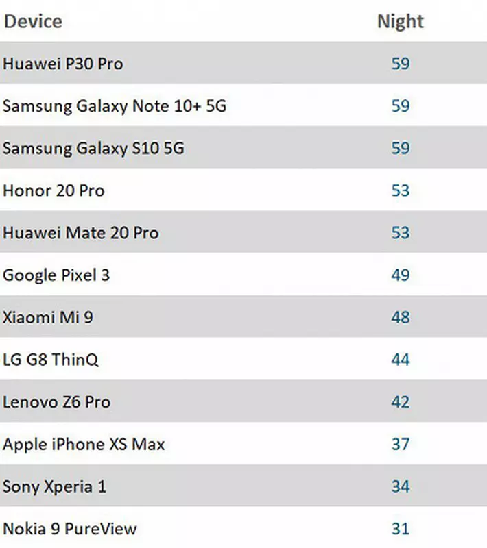 Jeśli chodzi o tryb nocny osobno, Samsung Galaxy Note10 + 5G, Galaxy S10 5G i Huawei P30 Pro przewodzą z dużą przewagą.