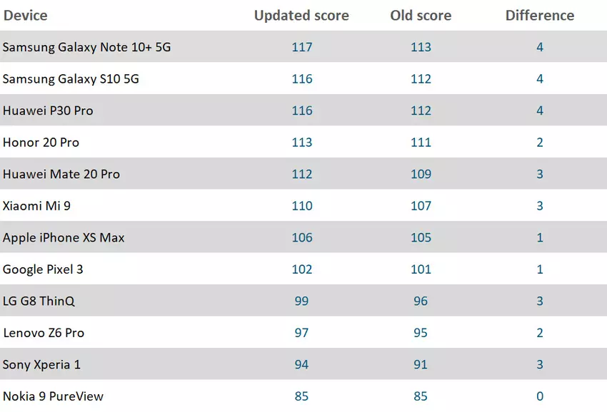 W związku z tym konieczna była aktualizacja ocen już przetestowanych smartfonów. Co prawda, przetestowano tylko 12 modeli. Średnio każdy z nich otrzymał dodatkowo od 1 do 4 punktów, tylko  Nokia 9 PureView pozostała z poprzednią oceną.