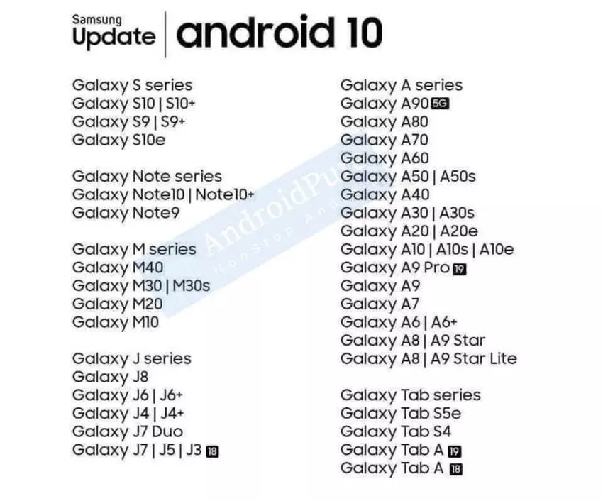 Lista obejmuje 45 smartfonów: Galaxy S10, Galaxy S10 +, Galaxy S10e, Galaxy S9, Galaxy S9 +, Galaxy Note 10, Galaxy Note 10+, Galaxy Note 9, Galaxy M40, Galaxy M30, Galaxy M30s, Galaxy M20, Galaxy M10, Galaxy J8, Galaxy J6, Galaxy J6 +, Galaxy J4, Galaxy J4 +, Galaxy J7 Duo, Galaxy J7 2018, Galaxy J5 2018, Galaxy J3 2018, Galaxy A90 5G, Galaxy A80, Galaxy A70, Galaxy A60, Galaxy A50, Galaxy A50s, Galaxy A40, Galaxy A30, Galaxy A30s, Galaxy A20, Galaxy A20e, Galaxy A10, Galaxy A10s, Galaxy A10e, Galaxy A9 Pro 2019, Galaxy A9, Galaxy A7, Galaxy A6, Galaxy A6 +, Galaxy A8, Galaxy A8 Star Lite, Galaxy A9 , Galaxy A9 Star Lite.