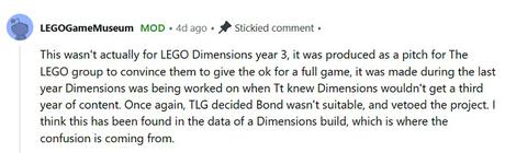 Gracze założyli, że zawartość Jamesa Bonda jest opracowywana na trzeci rok wsparcia dla LEGO Dimensions, ale moderator Reddit powiedział, że tak nie jest, a projekt miał być samodzielną grą. Grupa LEGO uznała jednak, że ostry thriller szpiegowski nie pasuje do swobodnego stylu jej projektów, więc gra została anulowana.