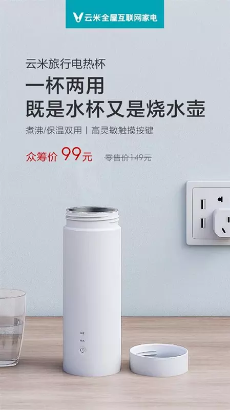 Korpus kubka jest wykonany ze stali nierdzewnej, ma pojemność 400 ml i waży tylko 0,5 kg. Na dole znajduje się przewód, który łączy się ze źródłem zasilania, gdy trzeba podgrzać wodę. Po użyciu można go ukryć z powrotem w konstrukcji. Moc urządzenia wynosi 300 watów.