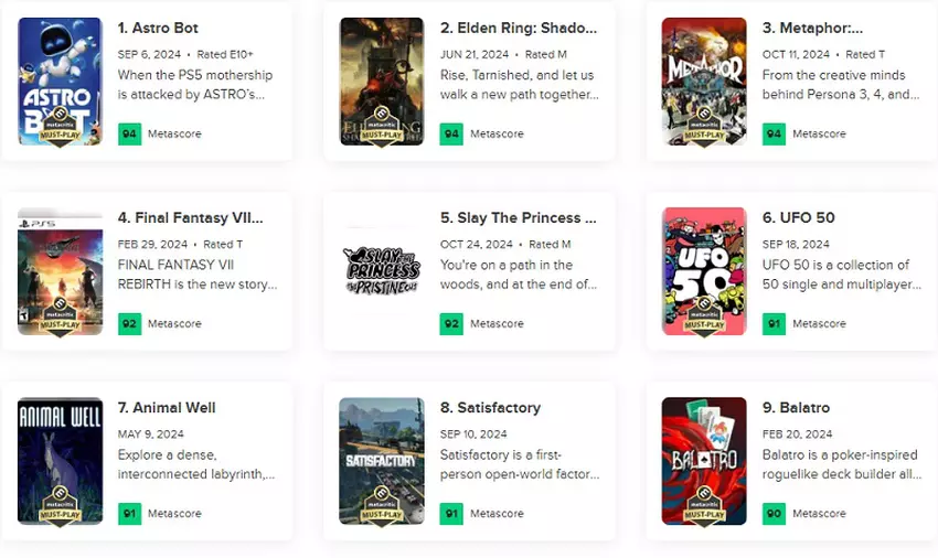 Według szacunków dziennikarzy, platformówka Astro Bot i JRPG Metaphor: ReFantazio stały się najwyżej ocenianymi grami 2024 roku. Pierwsze miejsce dzieli z nimi jednak rozszerzenie Shadow of the Erdtree do gry Elden Ring. Tym samym trzy projekty otrzymały po 94 punkty i stały się najlepszymi.