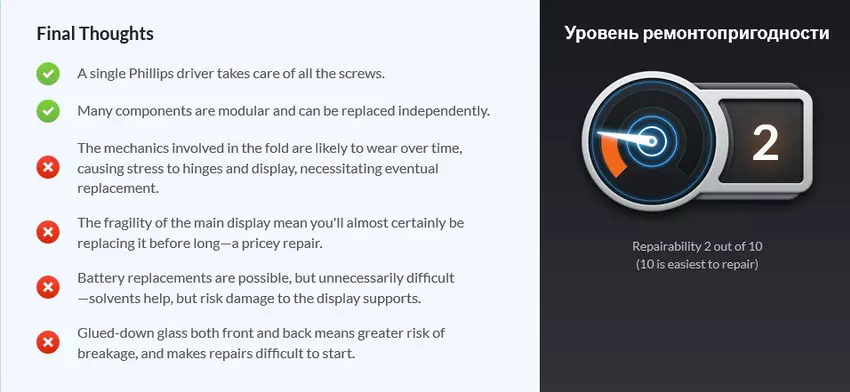 No i z możliwością naprawy w składanego smartfona wszystko jest źle: ekran i części mechaniczne są bardzo delikatne i wrażliwe, a wiele elementów jest modułowych, więc wraz z jedną częścią inne będą musiały zostać zmienione.