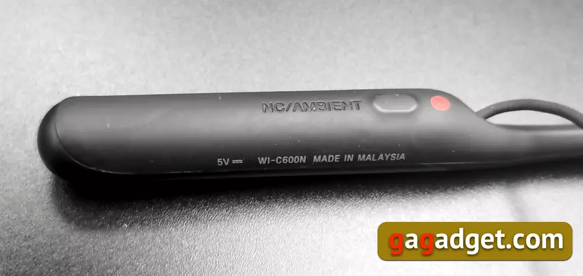 Po prawej stronie obudowy znajduje się przycisk kontroli redukcji hałasu. Aktywuje także tryb ambient-sound (po raz pierwszy spotkałem się z taką funkcją w modelu słuchawkowym Here One, który został wydany na Kickstarterze w 2015 roku, a dziś jest już w prawie co drugim modelu dobrych słuchawek). Wszystkie trzy tryby działają w kółko: dźwięk otoczenia, wyłączenie i dźwięk otoczenia, redukcja szumów. Z reguły użytkownik wybiera jeden odpowiedni dla siebie tryb dźwięku i nie wraca do tego przycisku