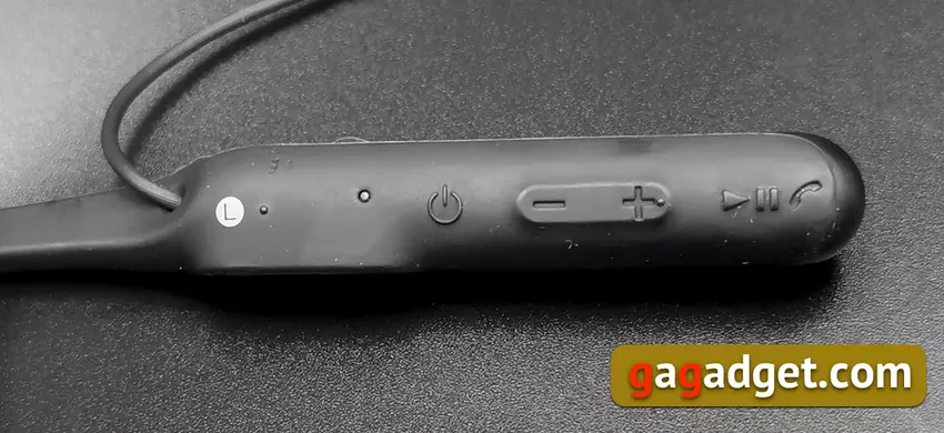 Najważniejsze elementy sterujące znajdują się po lewej stronie „kołnierza”. Z wyglądu wszystko jest proste i wyraźne - przycisk zasilania, przycisk regulacji głośności i przycisk uniwersalny, który służy do odbierania połączeń, odtwarzania muzyki, pauzy i przewijania do tyłu (podwójne dotknięcie - następny utwór, potrójne - poprzedni). Zaskakujące było to, że właśnie to sterowanie mnie irytowało. Pomimo tego, że wszystkie guziki są wypukłe i teoretycznie powinny być łatwo po omacku pracować „na ślepo”, w praktyce znalezienie przycisku zasilania w nocy, kiedy zdecydowałeś się poszukać w łóżku kilku świeżych odcinków na laptopie, było nie łatwym zadaniem. Wszystko potoczyło się dopiero po raz trzeci, przypominając dobrze znany żart o podłączeniu dysku flash do USB w ciągu tzrech raz ba znaleźć „właściwą” stronę. W rezultacie lepiej było wcześniej włączyć zestaw słuchawkowy, a dopiero potem założyć go na szyję. Nie było takich problemów z głośnością i przełączaniem kompozycji - rocker jest łatwiejszy do znalezienia, jest większy, a przycisk odbierania znajduje się na krawędzi obudowy. Ale trzykrotne naciśnięcie przycisku w celu powtórzenia utworu wciąż nie jest najlepszym rozwiązaniem. Chociaż ci, którzy nigdy nie przewijają do tyłu, nie powinni mieć problemów.
