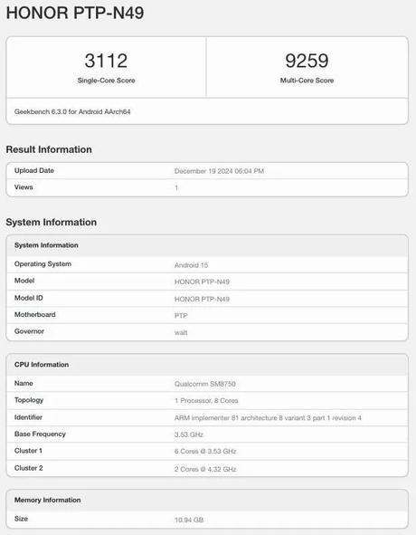 Urządzenie zostało przetestowane w Geekbench i uzyskało 3112 punktów w teście jednordzeniowym i 9259 punktów w teście wielordzeniowym. Testowany smartfon ma preinstalowany system Android 15 i jest wyposażony w 12 GB pamięci RAM. Numer modelu urządzenia to HONOR PTP-N49.
