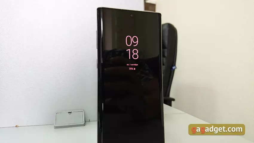 Smartfon ma 6,3-calowy wyświetlacz Dynamic AMOLED o zakrzywionych bokach i wydłużonym współczynniku proporcji 19: 9 oraz okrągły dekolt kamery przedniej. Rozdzielczość wynosi 2280 x 1080 (FullHD +), gęstość pikseli - 401 ppi (w porównaniu z 3040 x 1440 i 498 ppi dla większego modelu). Reszta wszystko jest prawie takie samo jak w starszym modelu: twierdzą, że obsługuje HDR10 +, 100% gama kolorów DCI-P3. Wizualnie wyświetlacz jest całkiem dobry. Pomimo mniejszej gęstości pikseli obraz nie wygląda na „luźny”, a czcionki są wyraźne. Ustawienia prawie całkowicie powtarzają starszy model: czarny interfejs, skalowane elementy interfejsu, regulacja czcionek, niebieski filtr, możliwość ukrywania wyłącznika kamery i Always On Display. Na miejscu Zniknęła jedynie możliwość wyboru rozdzielczości ekranu: