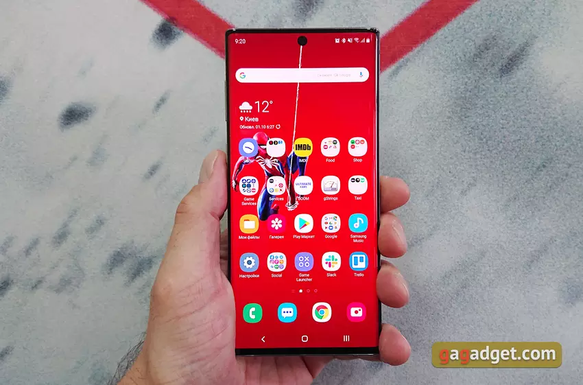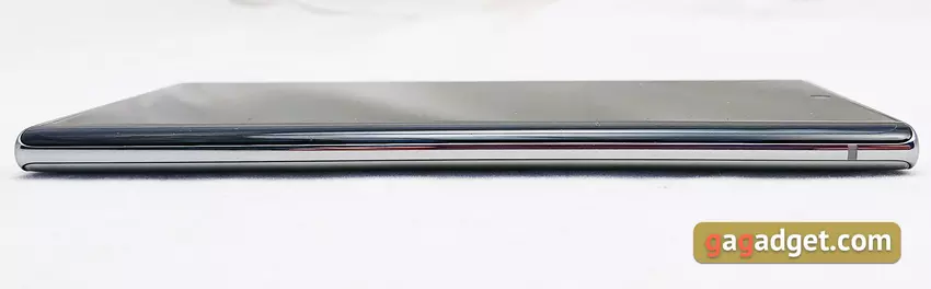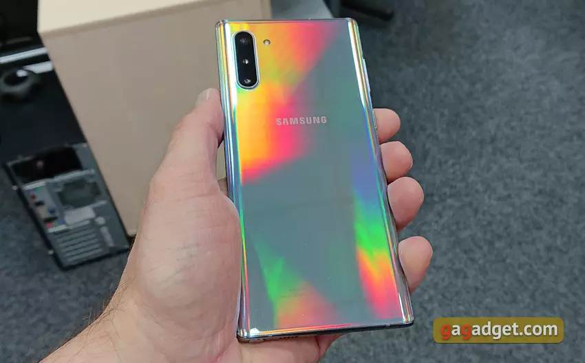 Galaxy Note10 wygląda jak mała kopia Galaxy Note10 +, co jest dość logiczne. Wyświetlacz na całym panelu przednim z minimalnymi ramkami, zakrzywionymi bokami i otworem na kamerę przednią, podobnie jak starszy model. Ale wymiary i waga są znacząco różne: 151x71,8x7,9 mm i 168 g w porównaniu z 162,3x77,2x7,9 mm, odpowiednio 196 gw Note10 +. Dzięki temu Note10 okazał się wygodniejszy, bardzo realistyczne jest używanie go jedną ręką do podstawowych zadań