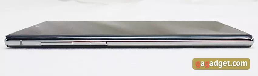 Metalowa rama i rozmieszczenie wszystkich elementów funkcjonalnych jest podobne do starszej wersji. W szczególności przyciski po lewej stronie, które niektórzy użytkownicy nie bardzo lubią. Zazwyczaj te przyciski są po prawej stronie, ale uzależnienie jest dość szybkie. Firma postanowiła porzucić przycisk Bixby w tej linii. Teraz domyślnie asystent głosowy jest wywoływany przez długie naciśnięcie przycisku zasilania, co nie jest zbyt wygodne. Ale w ustawieniach możesz poprawić ten moment i po długim naciśnięciu pojawi się bardziej znane menu do wyłączania / ponownego uruchamiania smartfona.