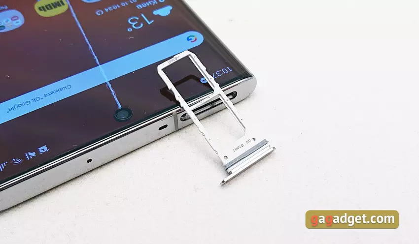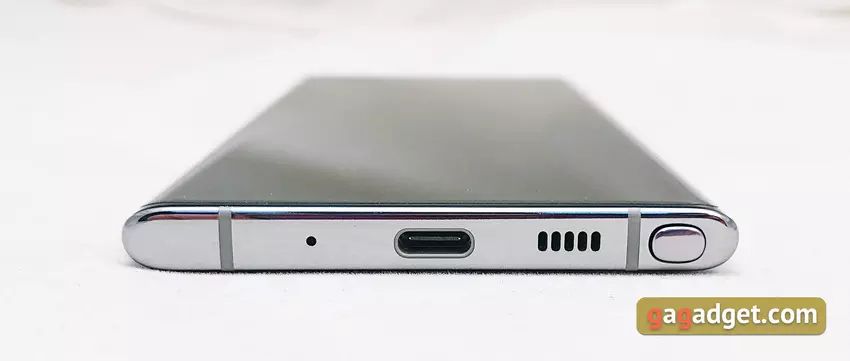 Na dole - pióro S Pen, mikrofon słuchawki, głośnik zewnętrzny i złącze USB Type-C oraz rysik S Pen. Niestety, nie ma złącza na 3,5 mm i adaptery innych firm, jak dowiedzieliśmy się z recenzji Galaxy Note10 +, nie działają: