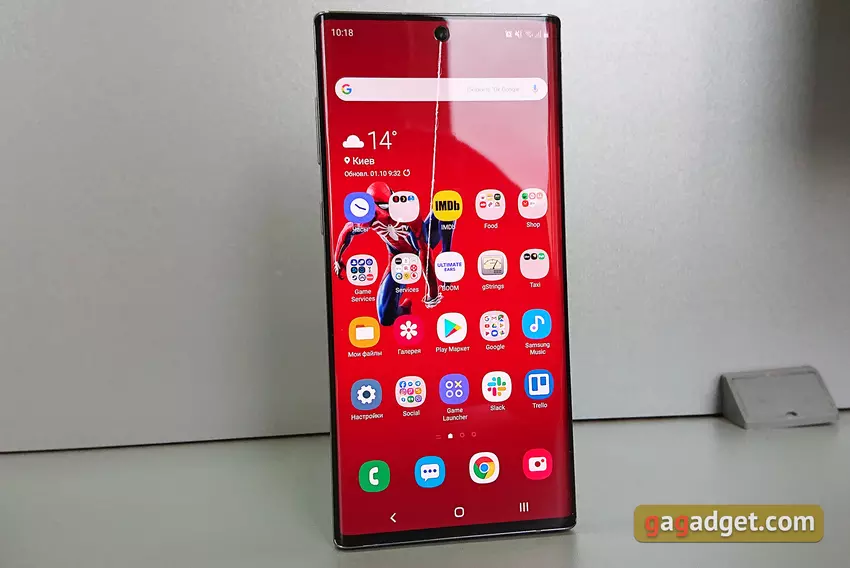 Jeśli chodzi o „wypełnianie” Samsunga Galaxy Note10 prawie całkowicie powtarza " Plus ": 7-nm Samsung Exynos 9825 o maksymalnej częstotliwości taktowania 2,73 GHz, moduł uczenia maszynowego Neural Processing Unit (NPU) i akcelerator graficzny ARM Mali-G76 MP12. Pamięć RAM jest nieco mniejsza: 8 GB zamiast 12 GB pamięci RAM i 256 GB wbudowanej, najszybszy w tej chwili UFS3.0, ale bez możliwości rozszerzenia. Wydaje mi się, że 256 GB wystarcza, chociaż nie wykluczam istnienia użytkowników, którzy zatkają pamięć zdjęciami i wideo 4K. Oczywiście nie ma problemów z wydajnością. W testach syntetycznych smartfon osiąga najlepsze wyniki, choć tradycyjnie pod względem ciężkiej grafiki najlepsze rozwiązania Qualcomm wygrywają trochę: