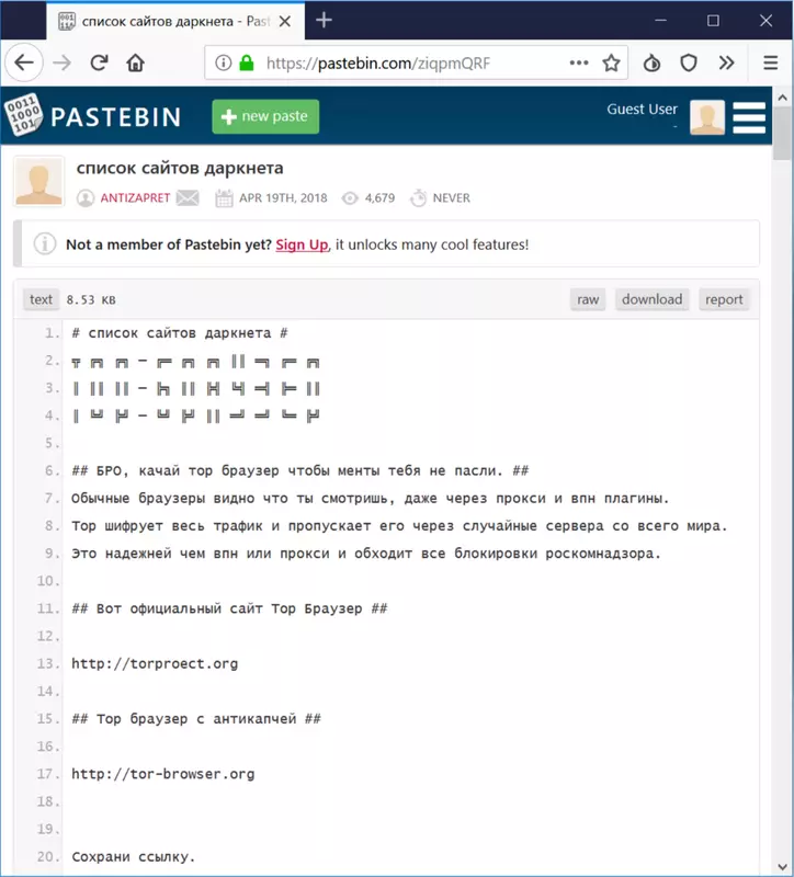 Przeglądarka Tor pozwala ominąć blokady i (co równie ważne) szyfrować wszystkie dane użytkownika, więc jego działania nie mogą zostać udostępnione służbom specjalnym. Oczywiście właśnie z tej okazji Tor i jego sieć są kochani przez przestępców sprzedających narkotyki, broń i złośliwe oprogramowanie lub skradzione bazy danych różnych firm na forach i stronach Darknet (najczęściej). Mogą to być dane użytkownika i / lub numery kart kredytowych. To nie jest tak, że zwykła „uczciwa osoba” nie ma nic do roboty na takich stronach (na przykład specjaliści od bezpieczeństwa informacji mogą się tam udać z powodu ich działalności zawodowej lub specjalnych usług z tego samego powodu), ale najczęściej kupujący Darknet dostają coś nielegalnego. W rzeczywistości przecież nie zaczniesz tworzyć internetowego sklepu z odzieżą i ukrywać go przed wyszukiwarkami? Cechą stron Darknet jest ich długi, niestrawny i trudny do zapamiętania adres, w tym losowy zestaw znaków. Z czego w rzeczywistości korzystają cyberprzestępcy, łatwo zmieniając je nawzajem bez żadnych podejrzeń ze strony użytkownika.