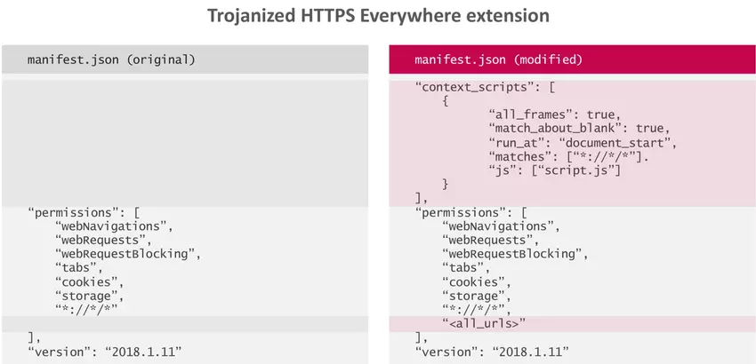 Różnice między kodem rozszerzenia oryginalnej i zmodyfikowanej (trojanizowanej) przeglądarki Tor: