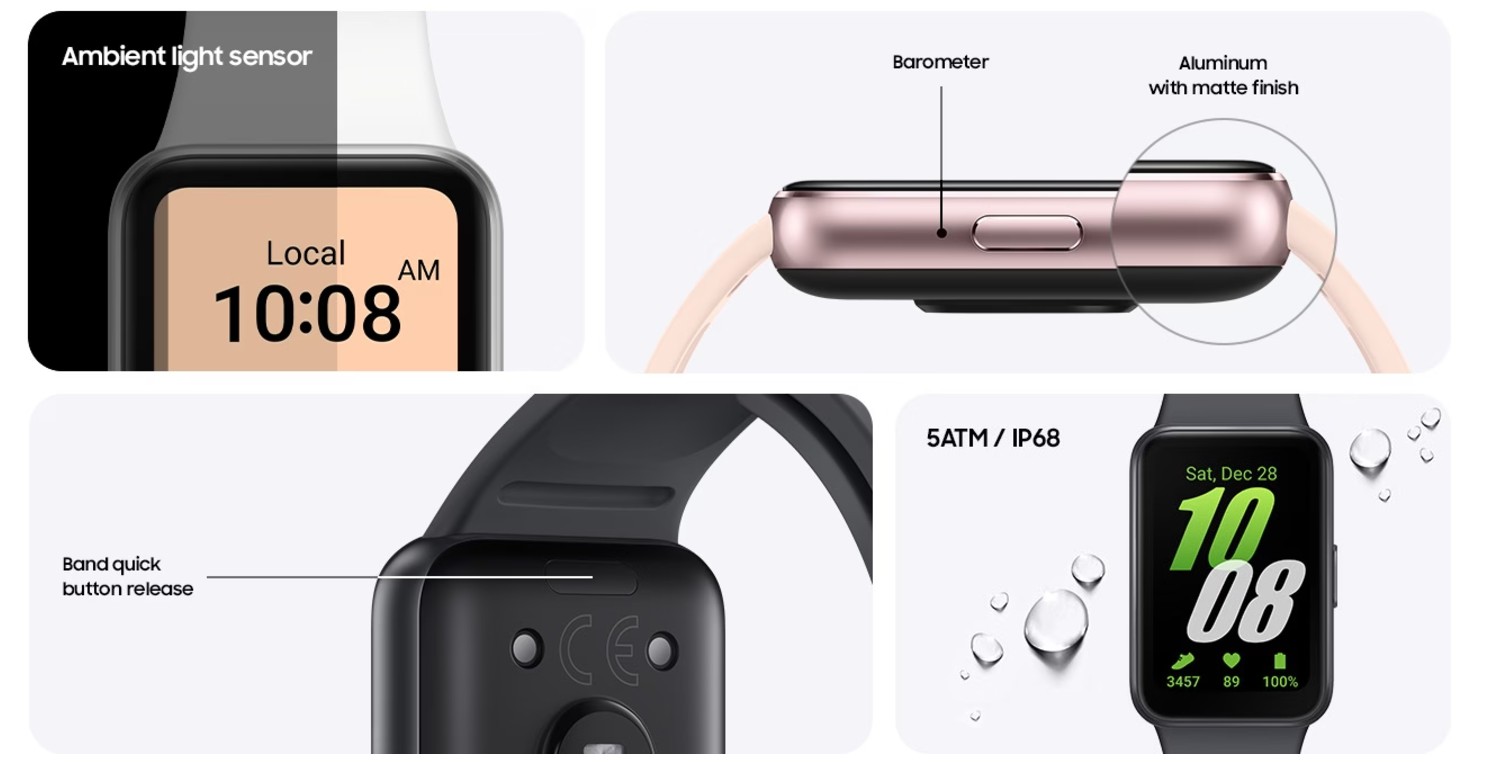 Galaxy Fit 3 posiada również ekran AMOLED z funkcją Always On Display (AOD), czujnik światła otoczenia, barometr i obudowę ze szczotkowanego aluminium. Posiada stopień ochrony IP68 dla odporności na kurz i wodę oraz 5ATM, co czyni go idealnym do uprawiania sportów i aktywności wodnych. Bateria może wytrzymać do 13 dni na jednym ładowaniu, co jest zaletą w porównaniu ze smartwatchami, które często wymagają ładowania już po jednym dniu.