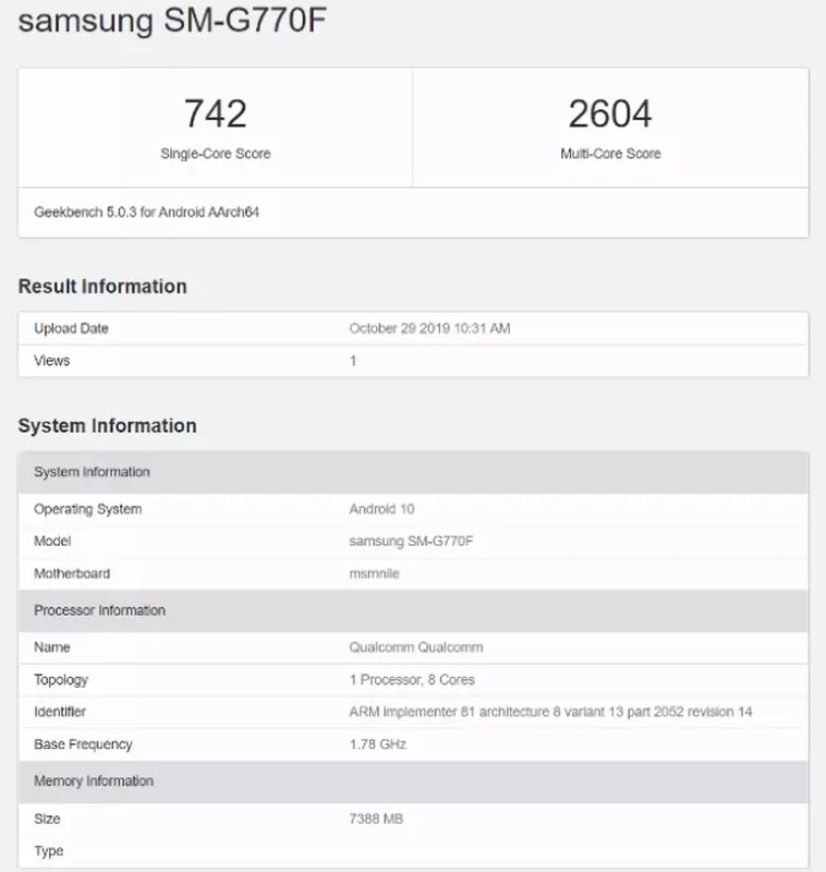 Smartfon o numerze modelu SM-G770F został zauważony w bazie danych testów wydajności. Według SamMobile jest to Galaxy S10 Lite. Urządzenie działa na najwyższym procesorze Snapdragon 855 sparowanym z 8 GB pamięci RAM. Najnowsza wersja Androida 10 jest zainstalowana na urządzeniu.