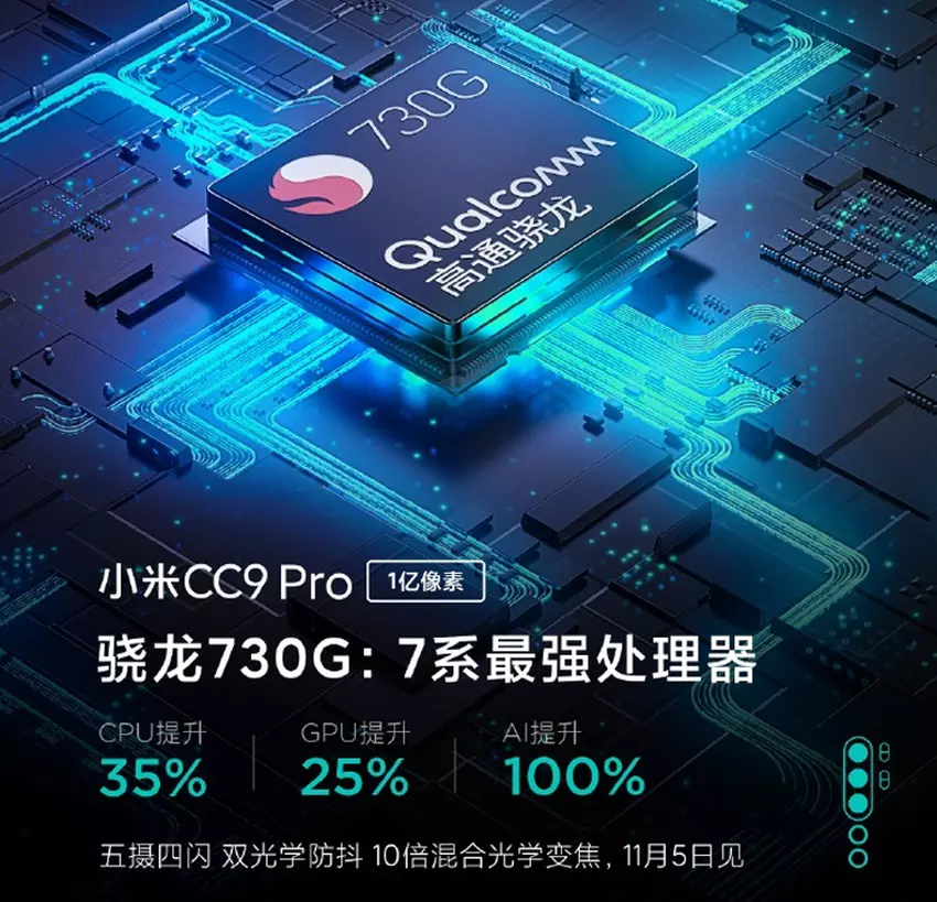 W ostatnich dniach Xiaomi opublikowało całą masę plakatów reklamowych z funkcjami CC9 Pro. Po pierwsze, firma potwierdziła, że smartfon otrzyma procesor Snapdragon 730G, i ogłasza wzrost wydajności procesora o 35%, a GPU o 25% i AI o 100% w porównaniu do poprzedniej generacji (Snapdragon 710 w CC9).