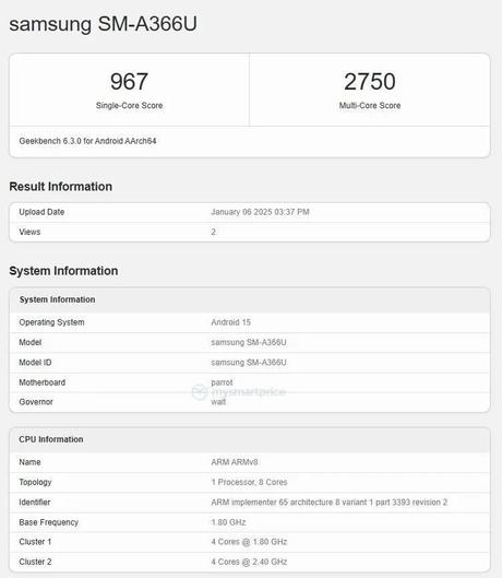 Galaxy A36 uzyskał 967 punktów w teście jednordzeniowym Geekbench i 2750 punktów w teście wielordzeniowym, co wskazuje na podobną wydajność do Exynosa 1380 zastosowanego w Galaxy A35. Dzięki 4 nm procesowi technologicznemu Snapdragona 6 Gen 3 oczekuje się, że smartfon będzie miał lepszą wydajność energetyczną.